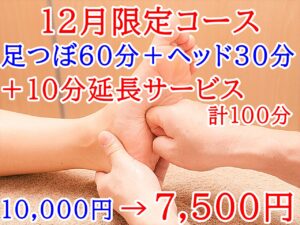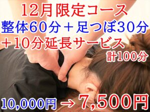 【お得☆12月限定】整体60分+足つぼ30分に(+10分)どちらか延長サービス。